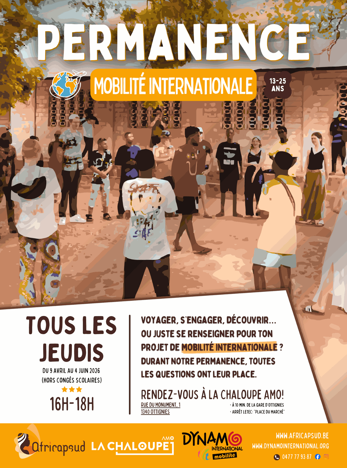 Une permanence Mobilité Internationale est organisée avec Dynamo International tous les jeudis, du 9 avril au 4 juin 2026 (hors congés scolaires), de 16h à 18h, à La Chaloupe Ottignies (rue du Monument, 1).